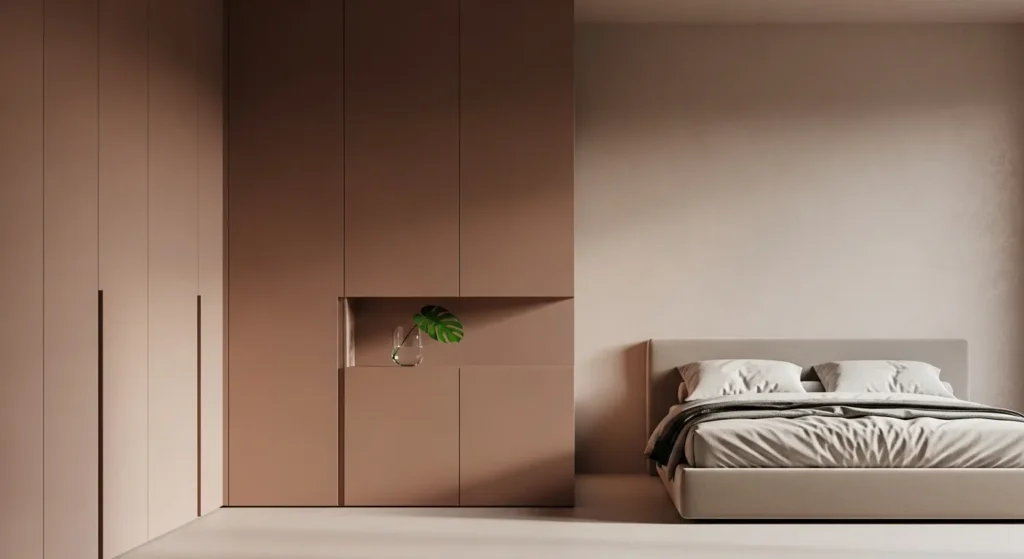 The Integrated Storage Wall layout is the ultimate solution for those seeking “Zero-Waste Geometry” and total visual clarity. This strategy involves dedicating one entire wall to a floor-to-ceiling, seamless built-in wardrobe finished in a matte lacquer that matches the Roman clay of the other three walls. By consolidating all storage—clothes, electronics, and books—into this single architectural plane, the rest of the bedroom is freed from the heavy footprint of dressers and chests. This allows for a much larger bed or a dedicated “Quiet Sanctuary” reading nook without the room feeling crowded. We style a small integrated niche within the wardrobe with a glass half-filled with water and a single green leaf, creating a “Collected and Creative” moment that feels high-end and deeply intentional.