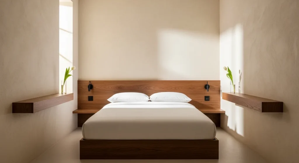 The Symmetrical Layout is a classic designer strategy used to create a sense of order and “Visual Silence” in a compact room. By centering a low-profile walnut or white oak bed against the primary wall and flanking it with identical bedside ledges, you establish a clear architectural axis that balances the room’s energy. To maximize the effect, utilize the “Shadow-on-Shadow” technique with Roman clay walls in a soft bone or sand tone, which catches the light and adds tactile depth without clutter. We style the bedside ledges with “Singular Intent”: a single glass half-filled with water and a long-stemmed white dahlia. This layout prioritizes a “Clean and Calm” horizon, making the walls feel further apart and the ceiling appear higher, ultimately creating a stately and grounded retreat for rest.