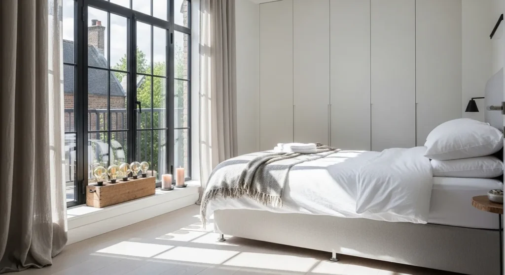 Positioning the bed directly under or in front of a window is a bold move that designers use to create a “Sun-Washed” focal point and maximize floor space. This Window-Centered Layout utilizes the natural light as a structural element, blurring the boundaries between the interior and the garden or city skyline outside. To prevent the room from feeling closed in, use sheer linen drapes that reach from the ceiling to the floor, adding a layer of “Soft Soul” and vertical height. The “Background Architecture” should feature a seamless built-in wardrobe on the opposite wall to hide “life clutter,” ensuring the primary focus remains on the light. Style the windowsill with a rustic wooden box holding specialized bulbs and a single burning candle to anchor the view in a state of optimistic, seasonal revitalization.