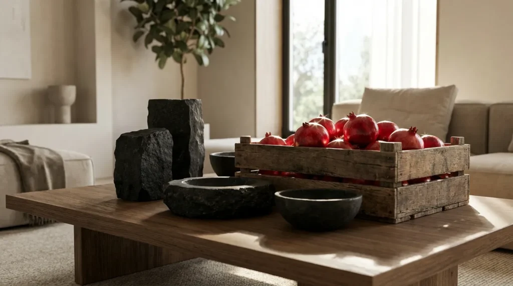 Incorporating bold accents into a cozy living room requires singular intent. We utilize deep charcoal or obsidian elements to provide a high-contrast anchor against neutral walls. This strategy mirrors the sophisticated energy of our Powder Room Ideas. We style the coffee table with a rustic wooden box of fresh pomegranates to provide a pop of organic color.