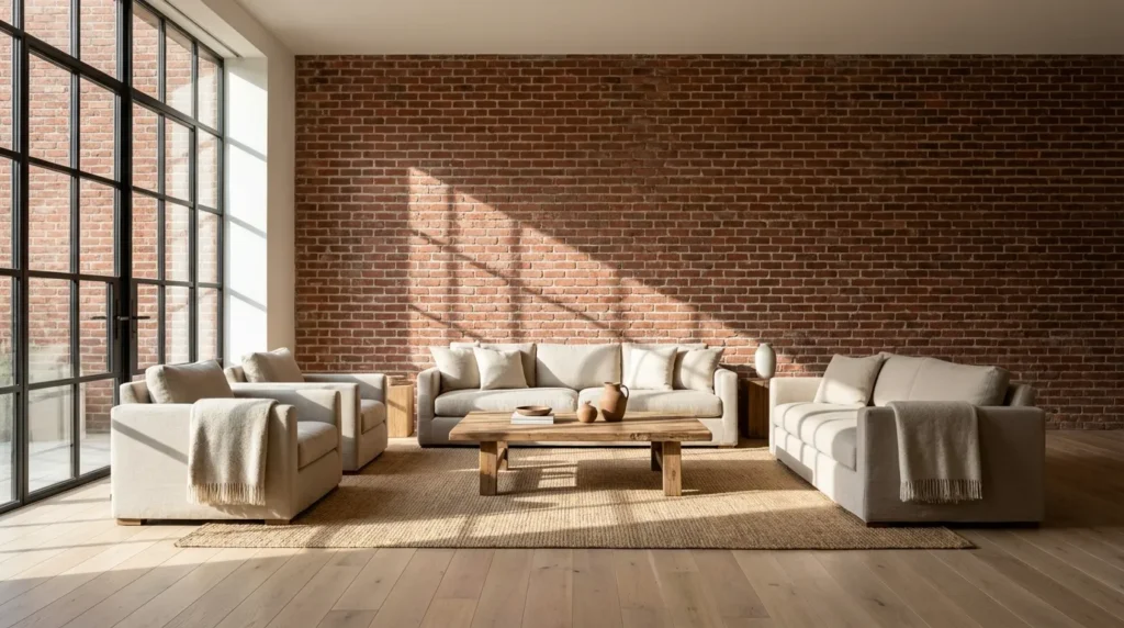 Creating a cozy living room with brick accents introduces a “Soft Soul” to an otherwise sharp, modern space. The rhythmic, structural element of brick provides a tactile backdrop that celebrates Grounded Materiality. The layout ensures a seamless “Visual Flow” between the masonry and wide-plank white oak floors. This focus on texture reflects the clarity found in our guide for a Modern Bathroom.
