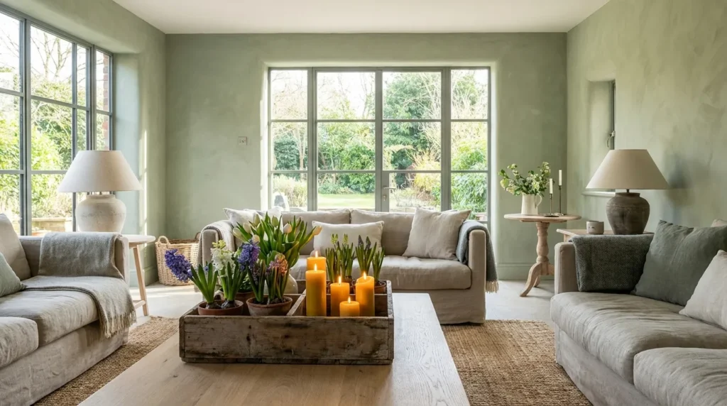 Incorporating sage green and earthy neutrals is a high-fidelity strategy for achieving Aqueous Serenity. These organic tones act as a bridge between the Outdoor Garden and the interior, creating an optimistic and unburdened environment. When applied to Roman clay walls, sage green provides a sueded texture that catches the “Sun-Washed” morning light. We style this soft green space with a rustic wooden box of specialized spring bulbs.