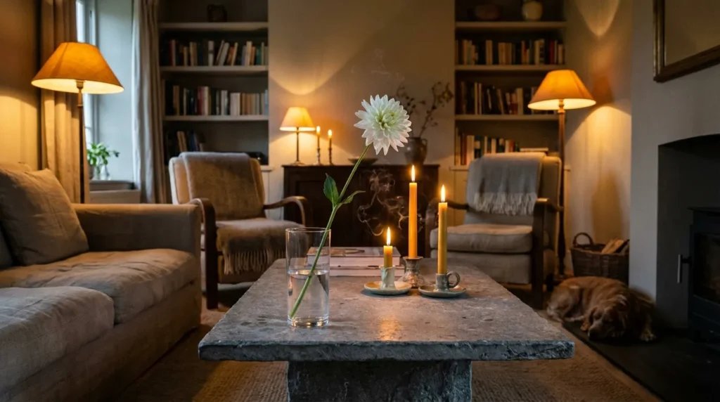 A tranquil oasis is achieved through the mastery of “Layered Lighting.” We move away from harsh overhead fixtures in favor of floor lamps and beeswax candles that provide a “Glowy” evening energy. This atmospheric approach ensures the living room remains a sophisticated haven for curated social connection. We style the evening scene with a glass half-filled with water and a single white dahlia.