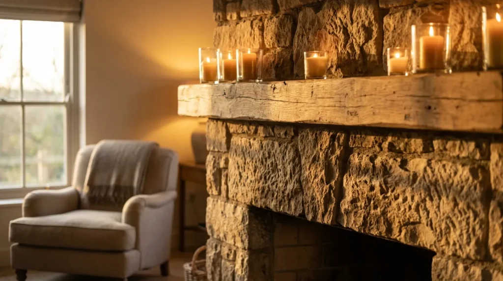 A rustic fireplace acts as the primary “Hard Architecture” anchor, providing a sense of Stately Permanence. Whether crafted from raw stone or aged timber, the fireplace introduces a “Raw Honesty” that absorbs the “Glowy” evening energy of a fire. For a consistent aesthetic, see how these materials translate to a Cozy Small Cabin Bathroom. We style the hearth with multiple burning beeswax candles to anchor the room’s sensory experience.